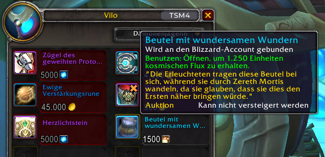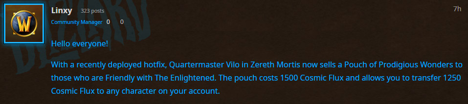 Seit heute Nacht habt ihr die Möglichkeit Kosmischer Flux an eure Twinks zu schicken. Bei Rüstmeister Vilo in Zereth Mortis gibt es jetzt das Item Beutel mit wundersamen Wundern. Dieser kostet euch 1.500 Kosmischer Flux und kann Battlenet accountweit an alle Twinks versenden werden. Eine kleine Gebühr behält Blizzard jedoch ein, denn euer Twink bekommt nur 1.250 Kosmischer Flux.
