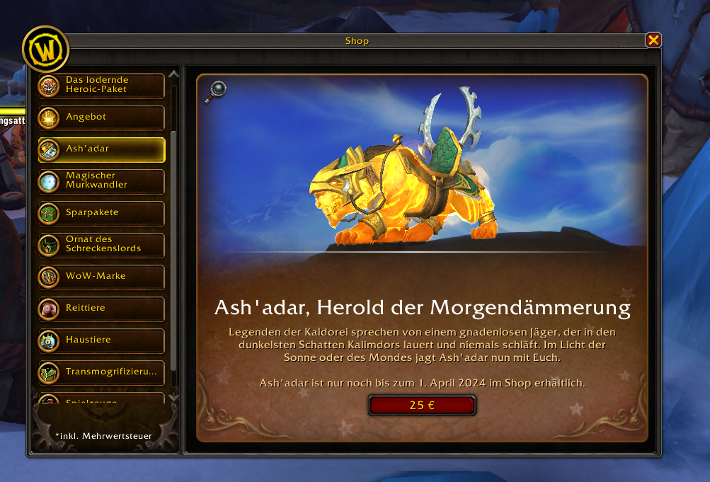 Ash'adar, Herold der Morgendämmerung ist ab sofort für 25 € im Battle.net-Store erhältlich. Ihr fragt euch, warum ihr keinen Tiger seht? Weil ihr den Tiger schon habt :D