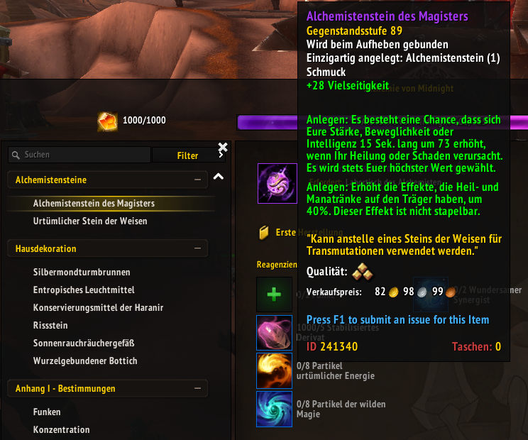 Urtümlicher Stein der Weisen und Alchemistenstein des Magisters (skaliert bis Gegenstandslevel 285).