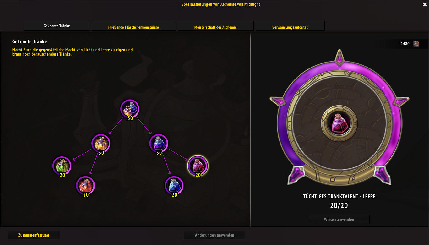 Das Rezept für den Kessel der Fläschchen der Sin'dorei gibt es über die Spezialisierung: Fließende Fläschchenkenntnisse (30). Das Rezept für den Kessel des Leerenlichttranks gibt es über die Spezialisierung: Gekonnte Tränke (30).