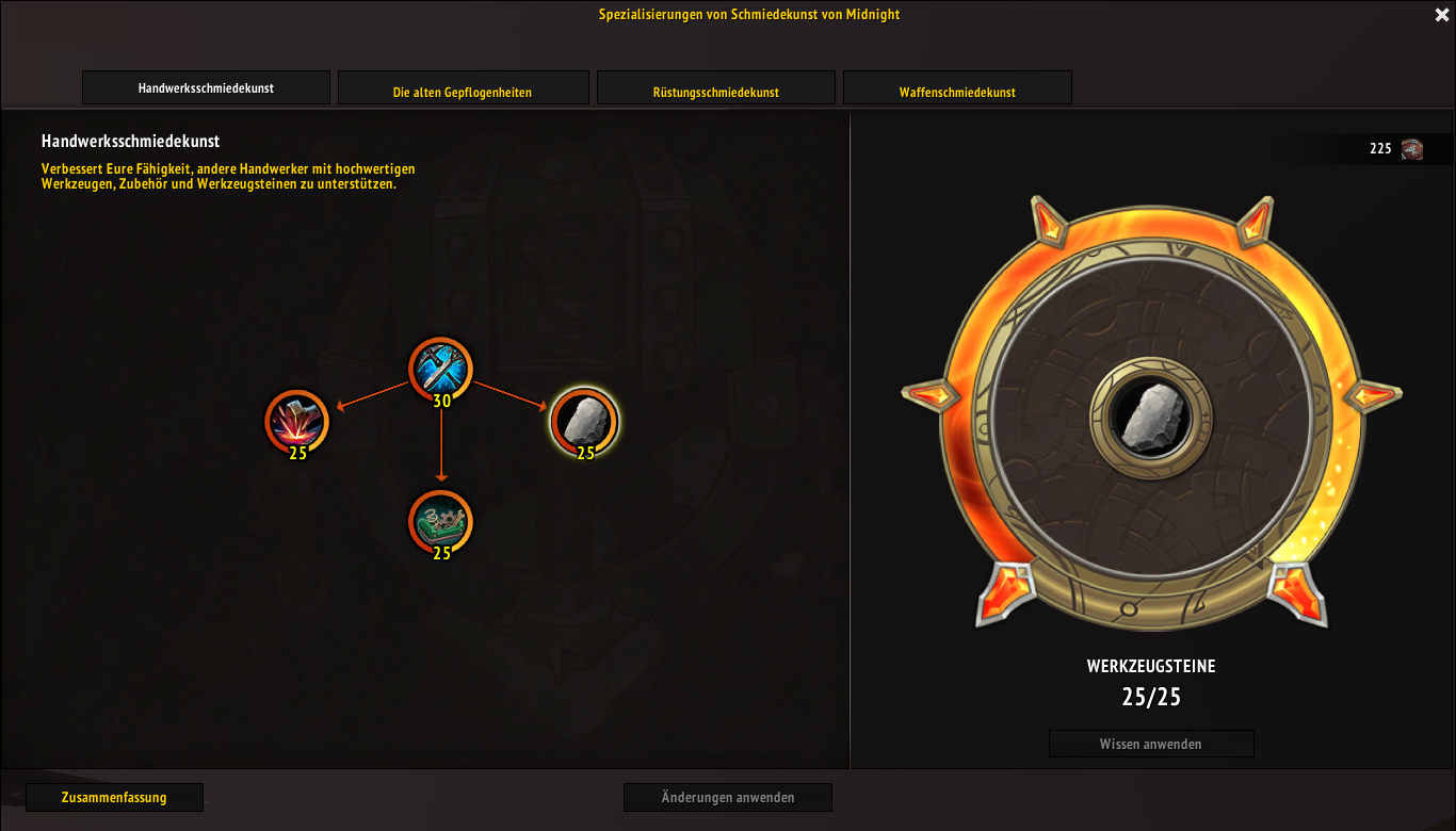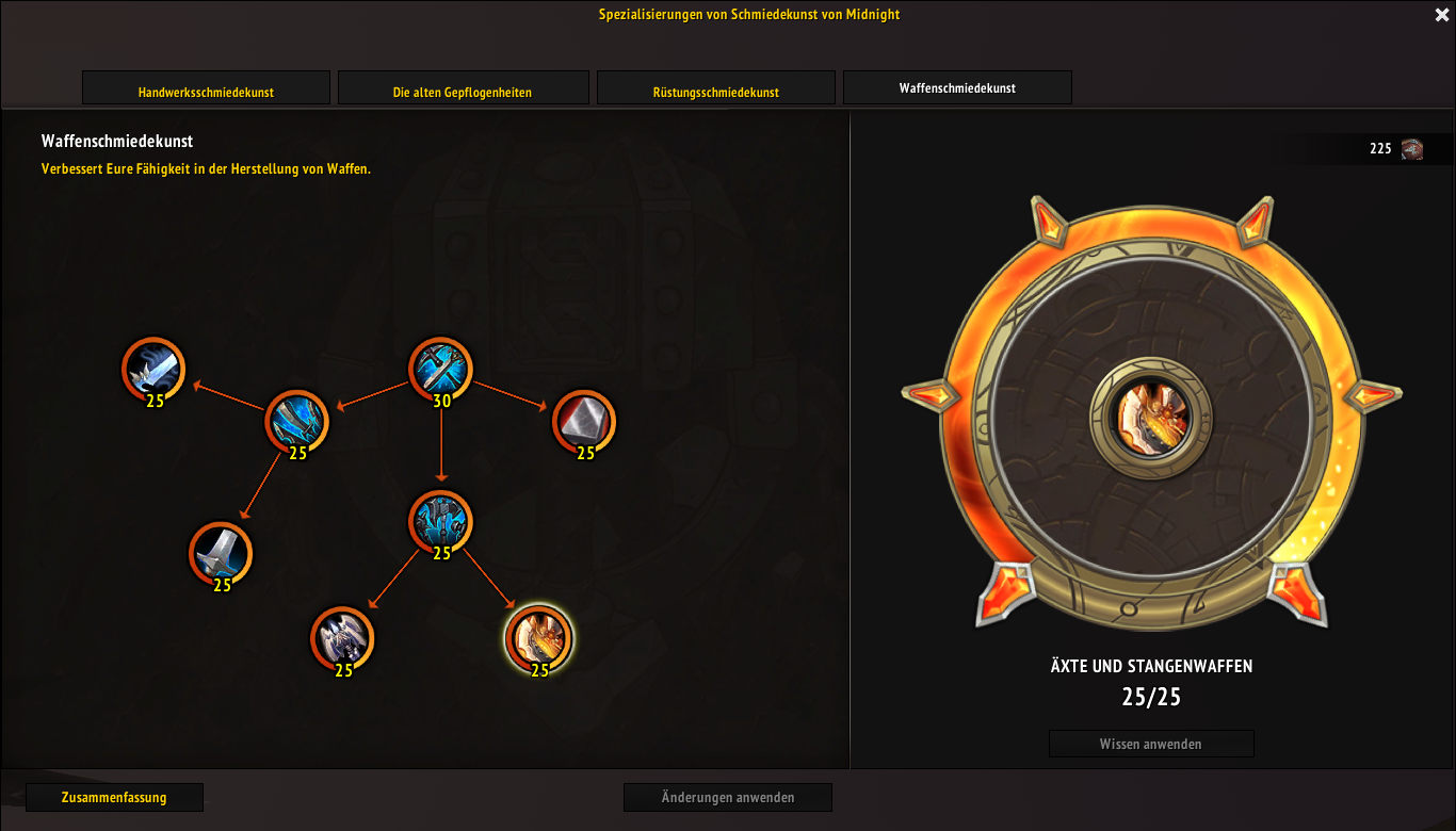 - Die Schmiedekunst hat 4 Spezialisierungen, welche mit Skill 25, 50, 60 und 75 freigeschalten werden.
