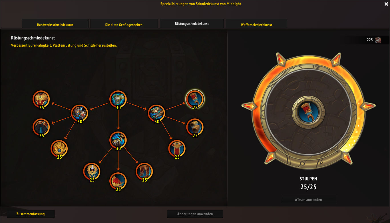 Da ihr während des Skillens nicht alle neu erlernten Pläne und Rezepte verwendet, solltet ihr diese im Anschluss dennoch 1x herstellen. Dabei bekommt ihr Wissenspunkte sowie Tatkraft des Schmiedefachmanns.