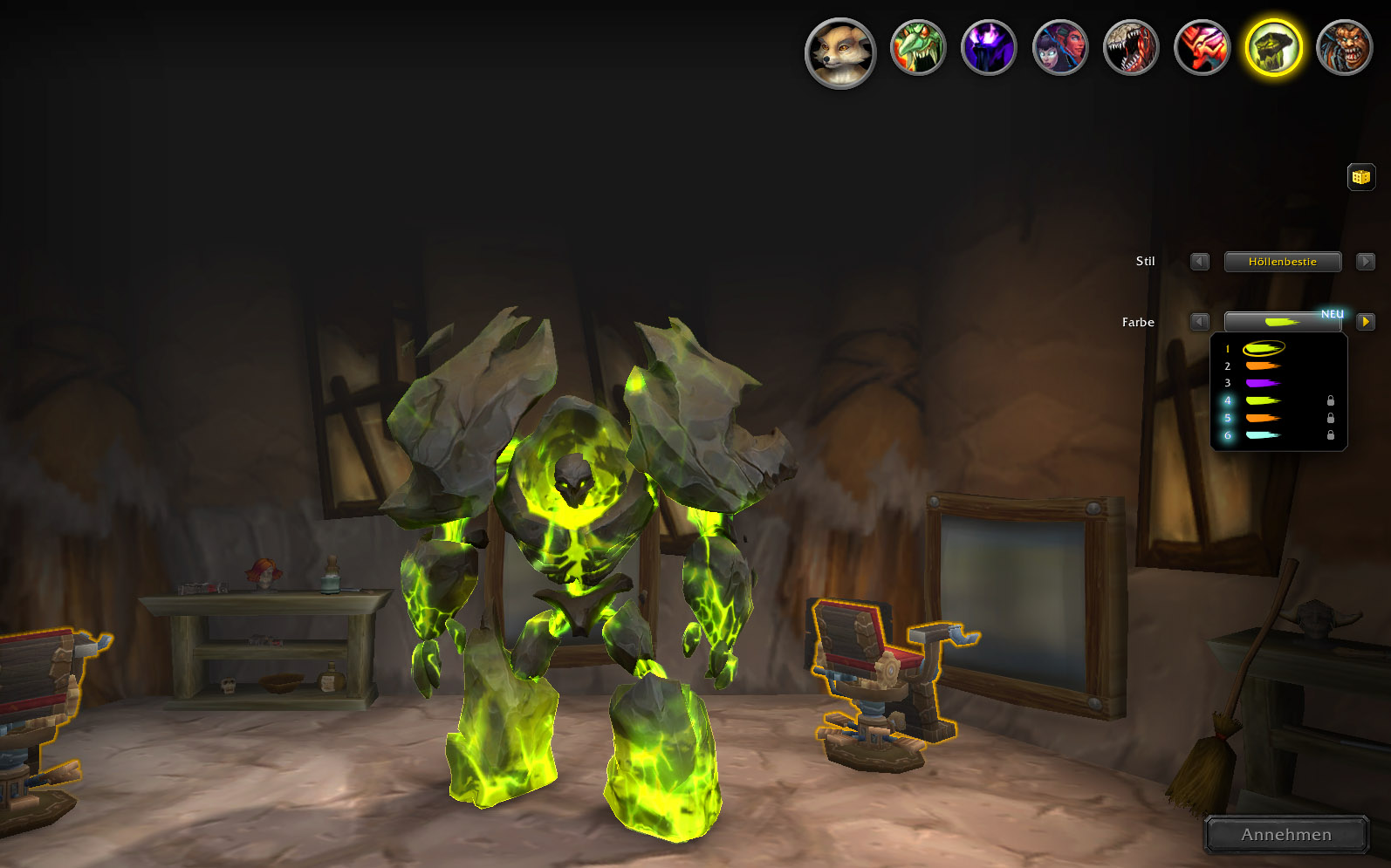 Seit Patch 10.1.5 habt ihr die Möglichkeit, eure Dämonen beim Barbier anzupassen. Hier findet ihr eine Übersicht der verschiedensten Skins für eure Wichtel, Leerwandler, Sayaad, Teufelsjäger, Teufelsfache, Höllenbestie und Verdammniswache. Einige Skins sind leider noch nicht entdeckt worden. Ich halte euch auf dem Laufenden.