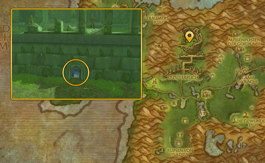 Für die Grimoire des verdammten Beobachters müsst ihr zum Dunklen Portal der Gegenwart. Das Dunkle Portal der Gegenwart ist grün. Sollte es rot sein, wechselt ihr die Phase bei Zidormi im Norden der Zone (Map).