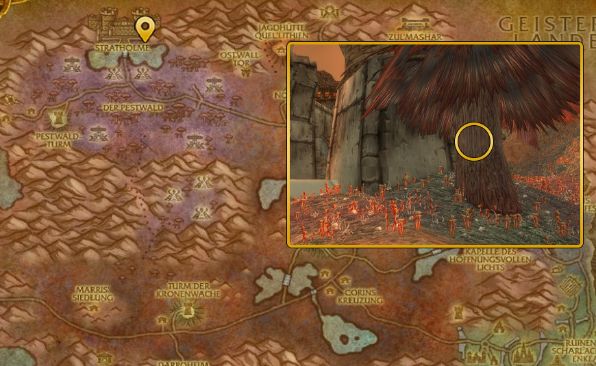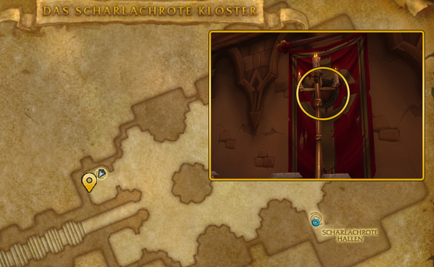 Für die Grimoire des eifernden Beobachters müsst ihr nach Tirisfal in das Scharlachrote Kloster. Ihr betretet keine Instanz, sondern geht die Stiege hoch zum Raum mit den Eingängen.