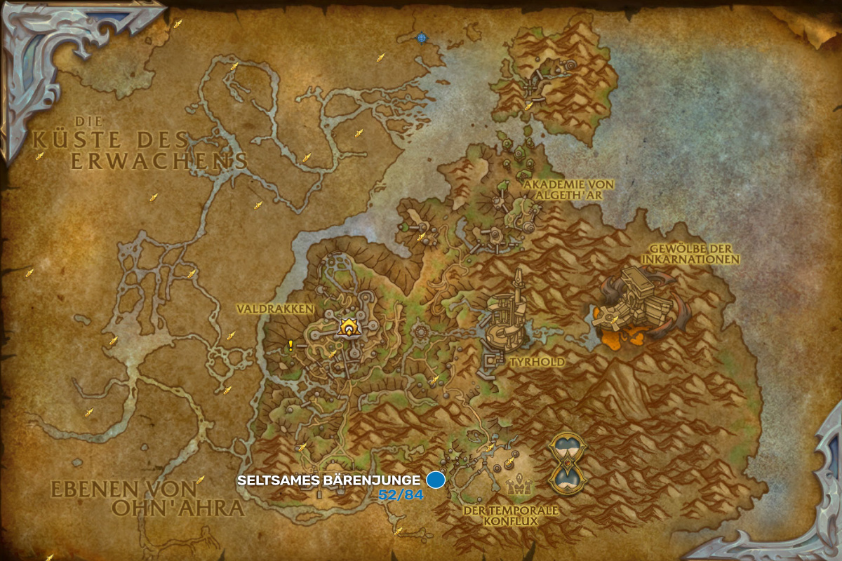 Eines dieser Haustiere ist Bärli. Durch die Beschreibung im Wildtierführer erfahren wir, dass das Pet etwas mit der Zeitmagie zu tun hat. Genauer gesagt finden wir das seltsame Bärenjunge in Thaldraszus im westlichen Teil vom temporalen Konflux – Ein Gebiet, wo Zeit eine ganz entscheidende Rolle spielt.