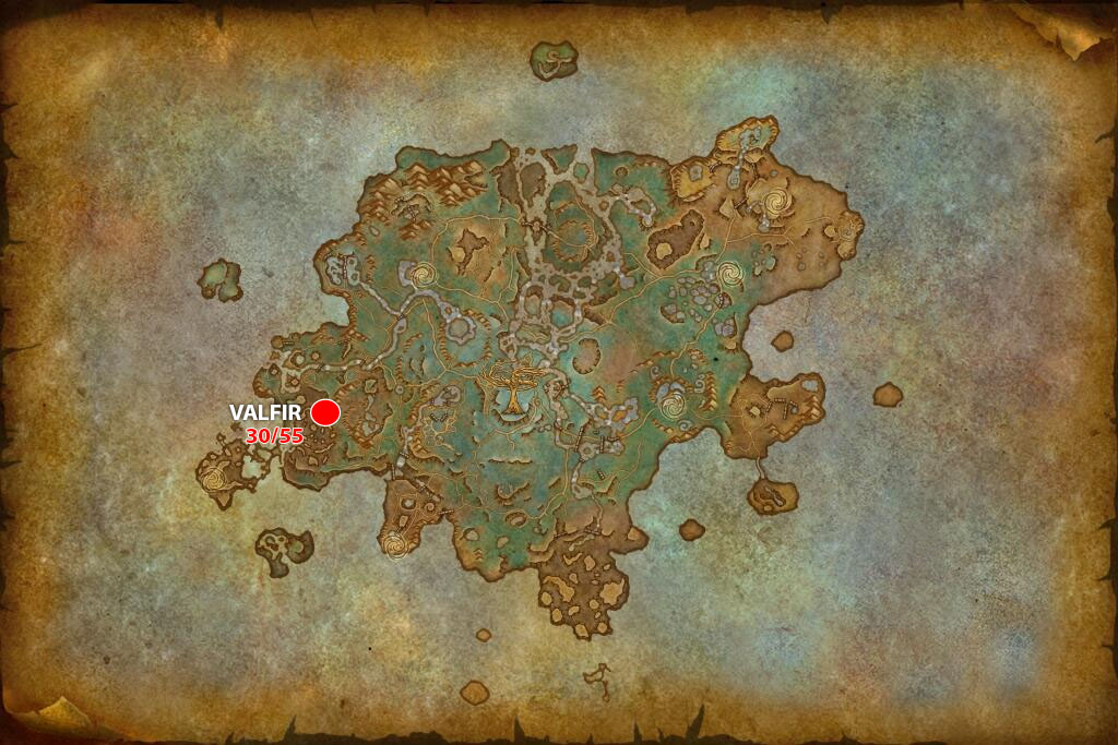 - Geh nun zu den Koordinaten 30.3 / 55.2 im Westen vom Ardenwald, wo du auf Valfir triffst. Dieser hat den Buff Nebelhafter Schleier, wodurch seine Ausweichchance um 200% erhöht ist.