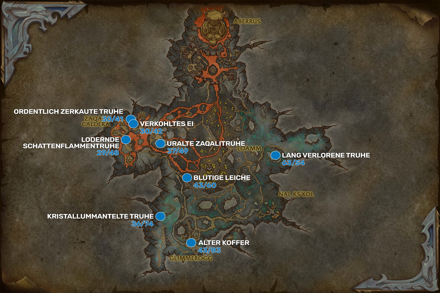 | Brodelnde Truhe | 32.3, 39.3 | Brodelnde Schnecke | Es müssen drei Stapel von Heimtückische Einsicht gesammelt werden, um die Schatztruhe zu sehen. Diese gibt es durch einen Klick auf Brodelnde Kugeln, die in der Zaralekhöhle verteilt sind. Wenn ein Spieler eine Kugel berührt, verschwindet sie auch für alle anderen Spieler und sie haben eine Respawnzeit von etwa 1 Stunde. Folgend einige Positionen: /way #2133 28.75 55.30 /way #2133 29.95 47.97 /way #2133 34.41 45.71 /way #2133 25.24 44.80 /way #2133 27.95 51.21 /way #2133 36.20 44.01 /way #2133 31.18 51.95 /way #2133 30.2 40.0 /way #2133 27.7 49.0 /way #2133 26.7 47 |