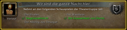 Die Theatertruppe ist eines der Welt-Events von Khaz Algar, welches euch wieder zahlreiche Belohnungen beschert. Die Irdenen sind Freunde des Theaters und möchten von euch Unterhalten werden. Aus diesem Grund müsst ihr euch um die Vorbereitung der Vorstellung kümmern sowie seid Teil der Aufführung.