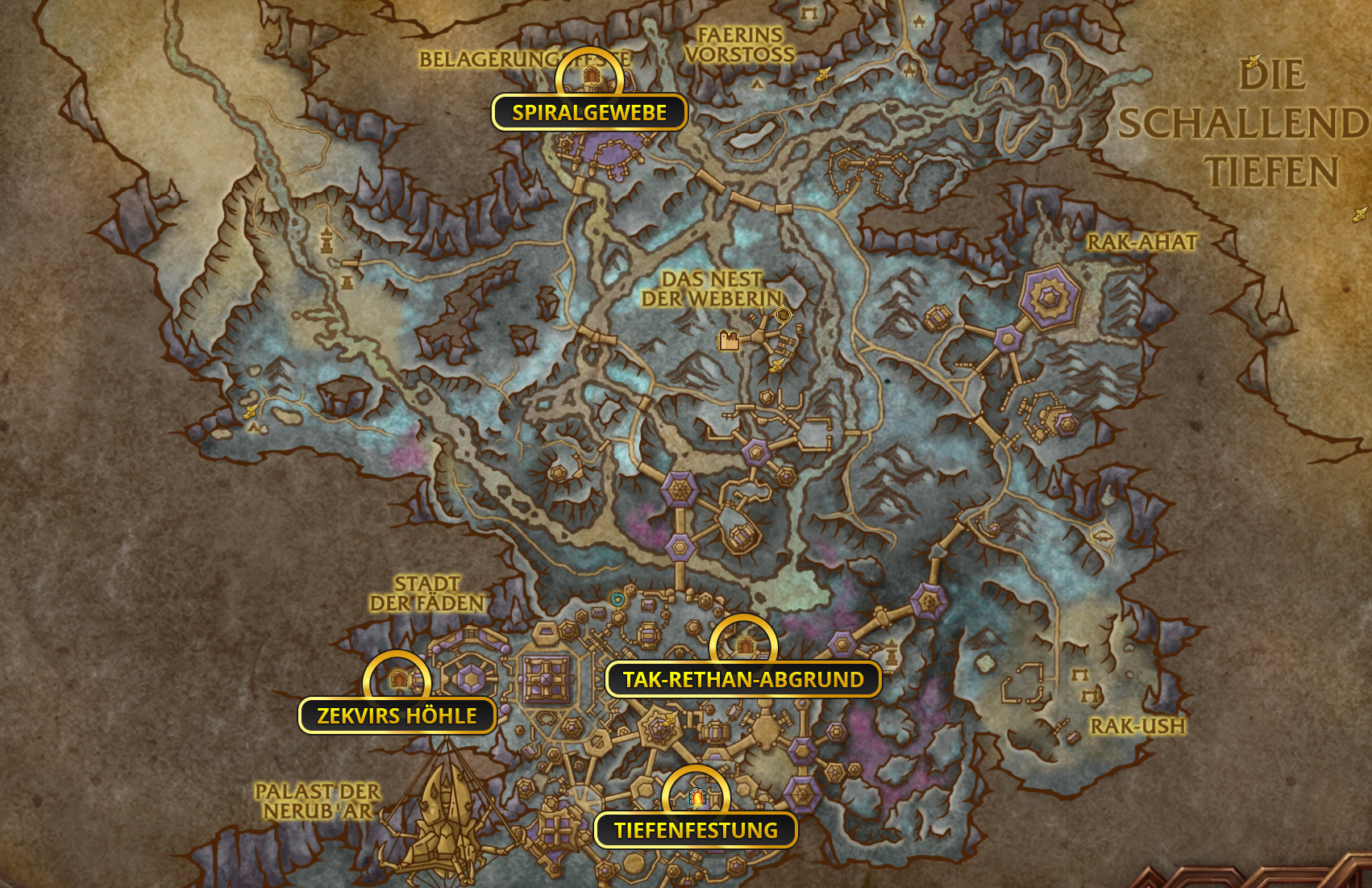 Grundsätzlich gilt: Ihr könnt jeden Tiefeneingang anklicken, dann wird euch automatisch vom Spiel eine Zielmarkierung erstellt und ihr erhaltet einen Pfeil auf der Minimap, dem ihr zum Eingang der Tiefe folgen könnt. Für einen groben Überblick sind hier auf allen Karten die Eingänge markiert: