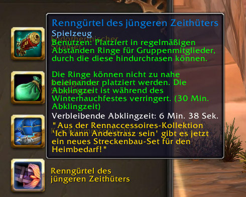 - Renngürtel des jüngeren Zeithüters: Aus der Rennaccessoires-Kollektion ‚Ich kann Lord Andestrasz sein‘ gibt es jetzt ein neues Streckenbau-Set für den Heimbedarf! Hinterlässt gelegentlich Ringe zum Hindurchfliegen für Gruppenmitglieder.