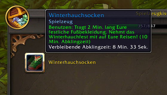 - Winter Veil Socks: Tragt Eure festliche Fußbekleidung, um das Winterhauchfest mit einer Spur aus frischem Schnee immer dabei zu haben! Kalt in der Maschine waschen und zum Trocknen in den Wind hängen.