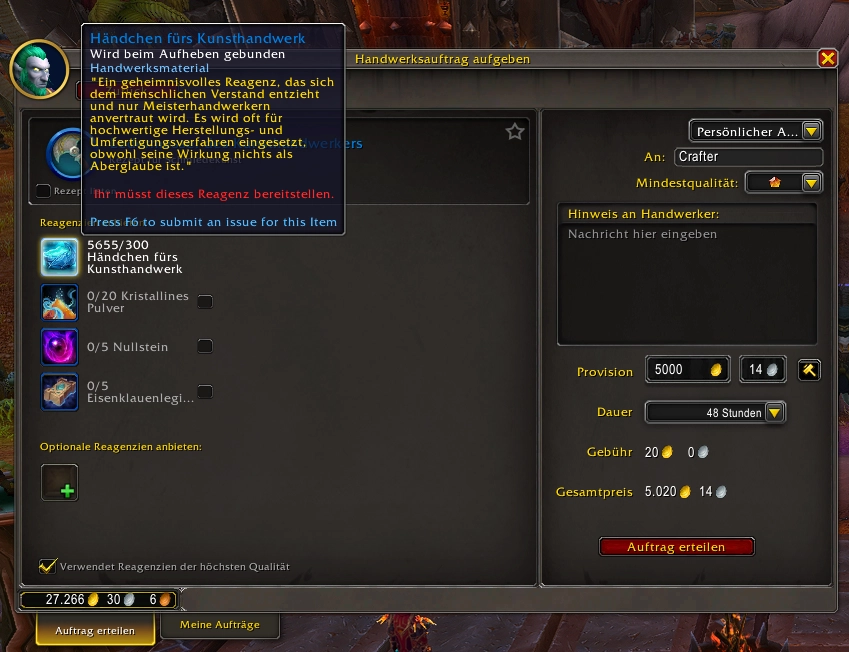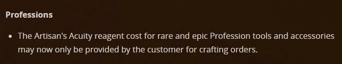 Das hat Blizzard nun gemerkt und mit einem Hotfix eingestellt, dass der Auftraggeber auch bei persönlichen Aufträgen den Eifer des Handwerkers bzw. für The War Within das Händchen fürs Kunsthandwerk stellen muss.