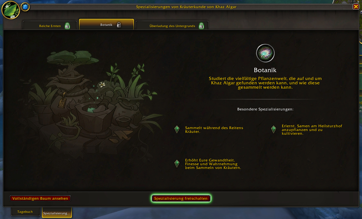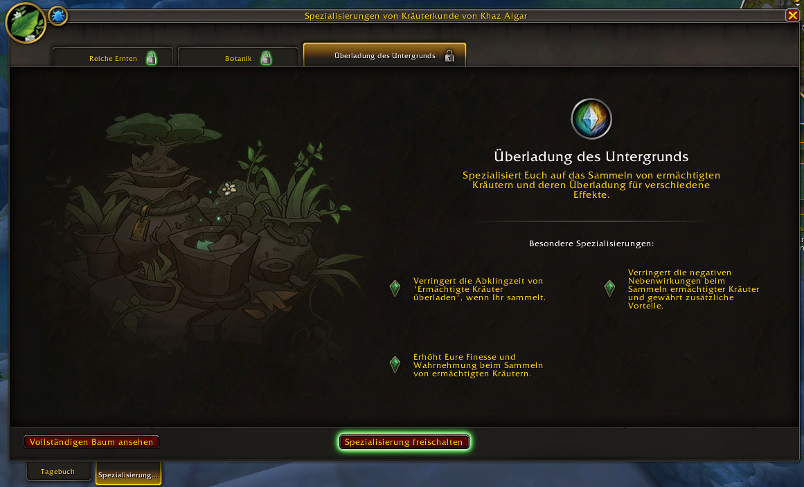 Die Spezialisierungen der Kräuterkunde von Khaz Algar sind ähnlich aufgebaut, wie auf den Dracheninseln. Es gibt die drei Spezialisierungen Reiche Ernte, Botanik und Überladung des Untergrunds.