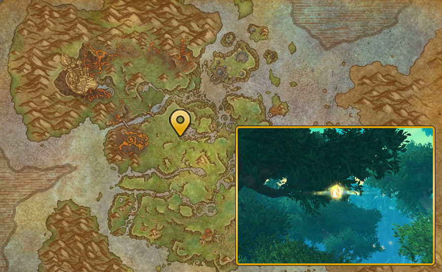 Für diese Drachenglyphe müsst ihr auf eine Steinplattform östlich vom Auge von Ysera. Diese ist sehr weit oben! Die Glyphe schwebt zwischen zwei großen Bäumen