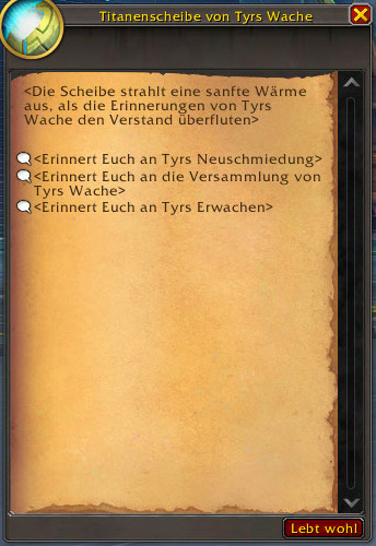 Benutzen: Beschwört eine Titanenscheibe, um in die aufgenommenen Erinnerungen zu blicken. Nur in Tyrhold und Valdrakken verwendbar. (1 Stunde Abklingzeit)